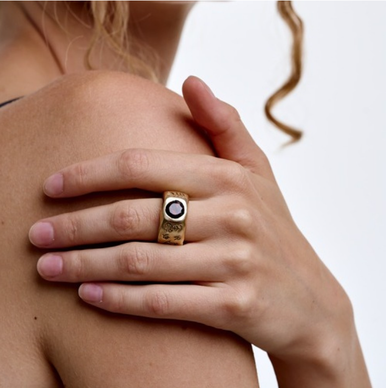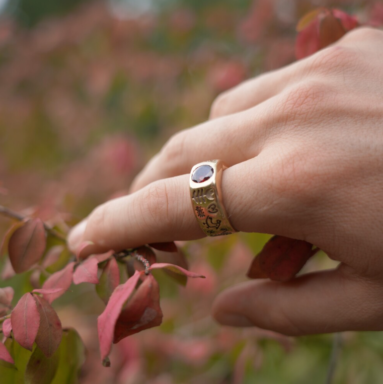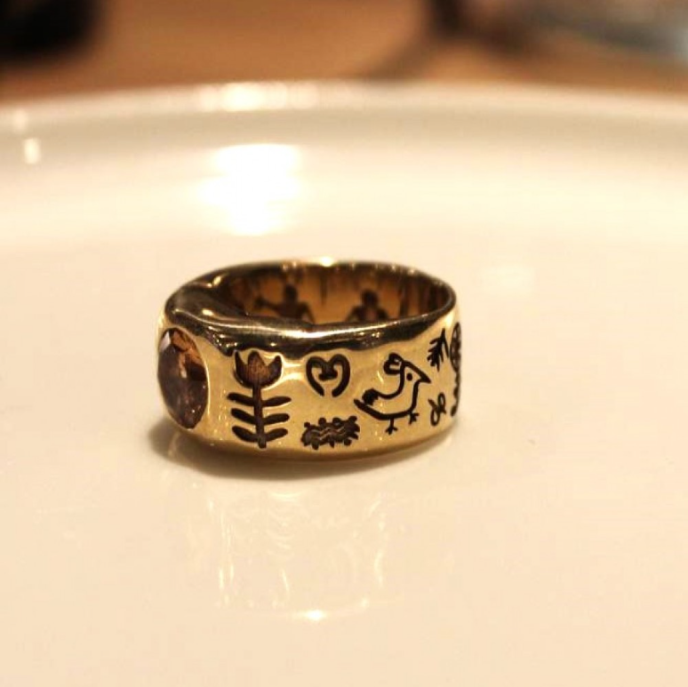 The ring shows the symbols of a fertile field: flowers, herbs, a bird, water, and sun. Inside are images of happy people dancing and being grateful for the harvest.