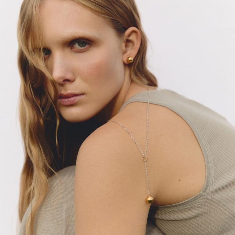 A striking duo: the sculptural Wrecking Ball Necklace and the versatile Golden Planet Earrings. Wear them solo or together for a statement that breaks the mold.